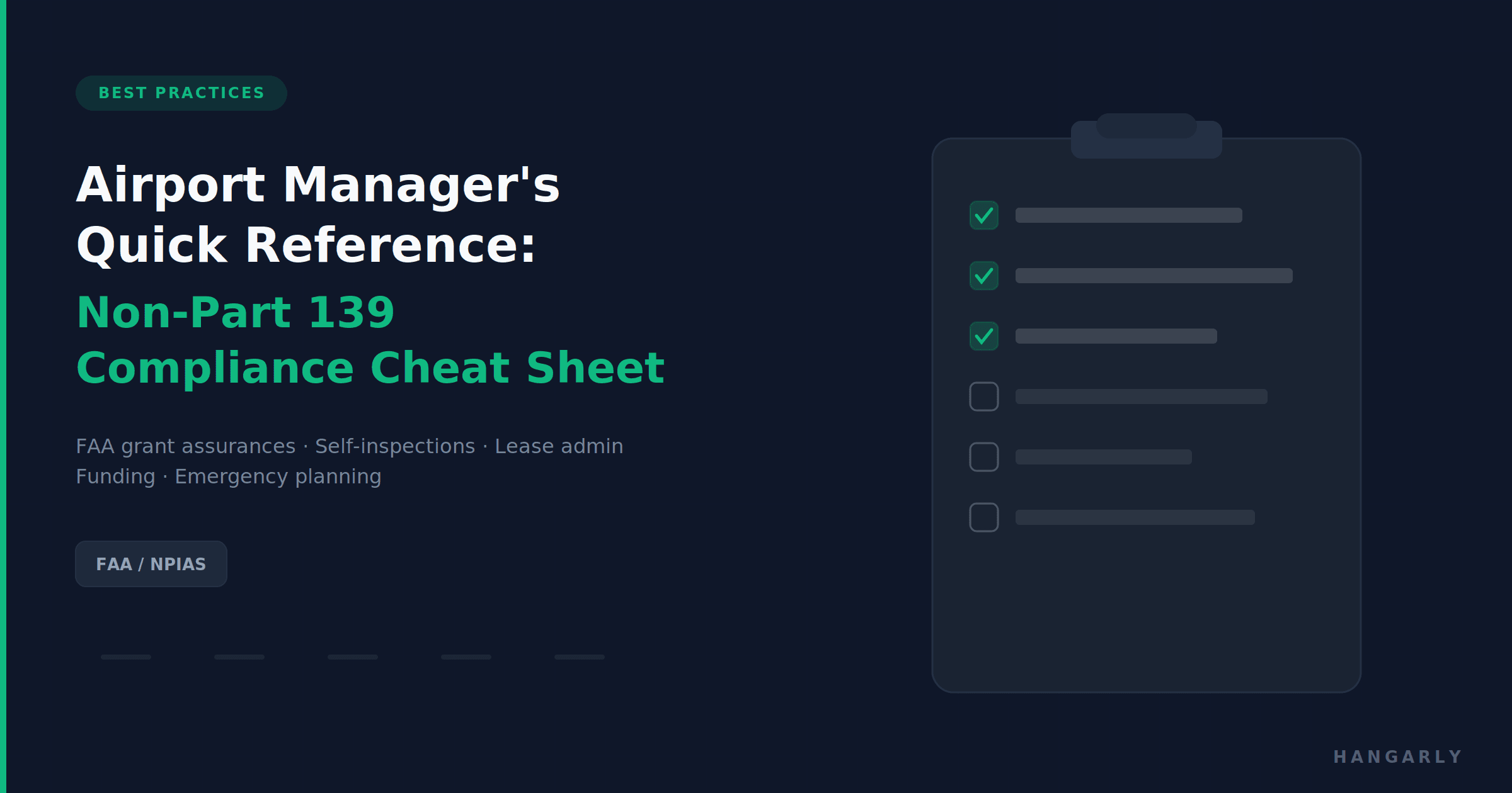 The United States has roughly 3,300 NPIAS airports — about 88% are general aviation fields operating without Part 139 certification. This quick-reference covers the essentials every non-Part 139 airport manager needs to know. Click any section to expand.